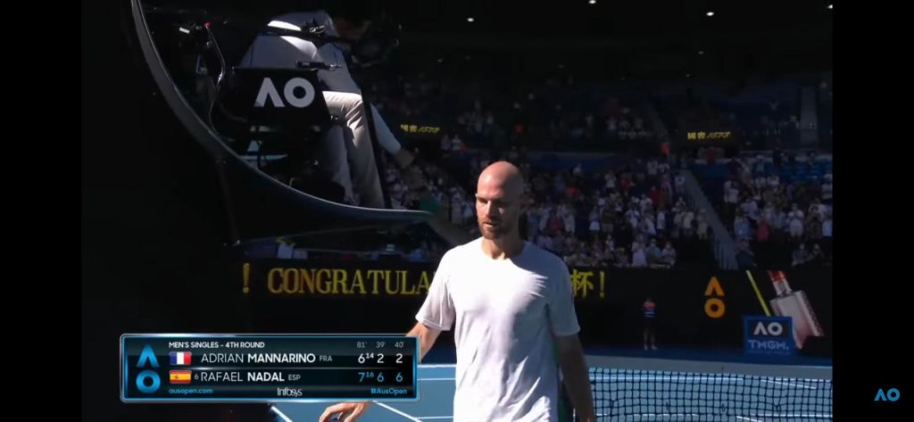 I hope this is the case, because the rest of the match was brutal. It was obvious after the first few points of the second set that Mannarino’s legs were gone. He may have been injured; he got a visit from the trainer at 2-5 in the second set. When Mannarino was being worked on, Pat Benatar’s “Hit Me With Your Best Shot,” blared from the Rod Laver Arena speakers. Tennis has a sadistic sense of humor.