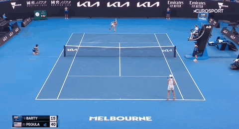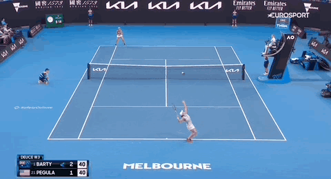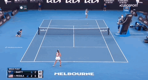 - Short in the ad-court: A slice exhibition from Barty (top). The side-spin to the forehand puts Pegula (bottom) out of position and Barty finesses the final shot short to force the error.