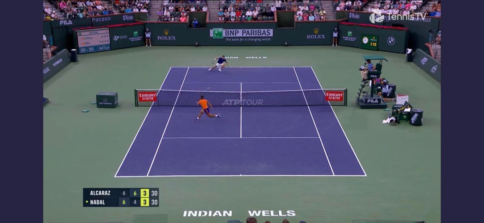 28. Nadal is better served trying to hit the ball past Alcaraz than by trying to fool him with drop shots. Alcaraz is too fast, and too good of a vertical mover, for them to work very well.