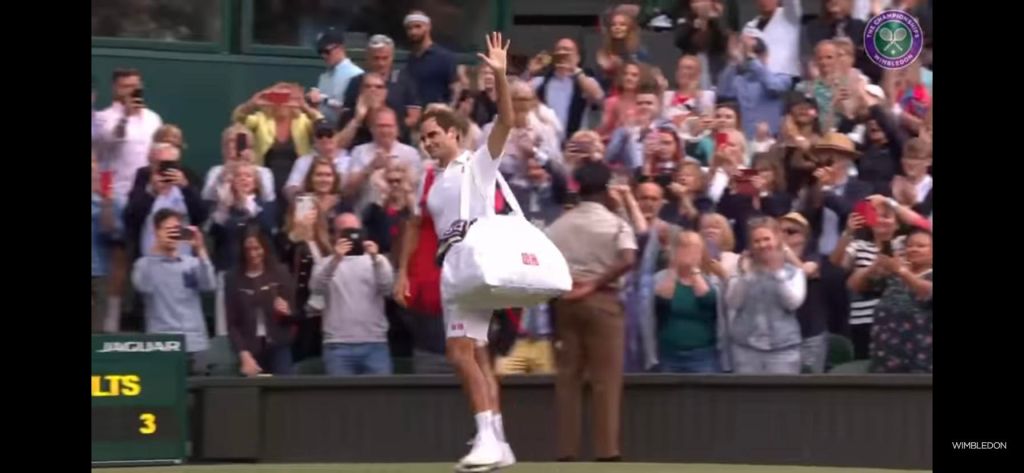Federer waves to the Center Court crowd after losing to Hubert Hurkacz in the quarterfinals last year. Screenshot: Wimbledon
