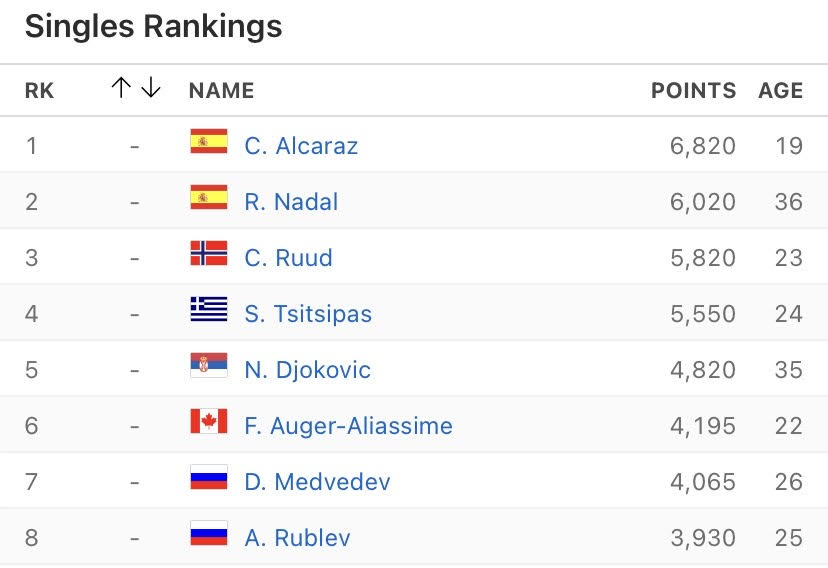 A suggestion would be to weight 12-month rankings more heavily in more recent results. Essentially in a 12-month ranking, results from over 3 months would reduce in worth by 25%, 50% for over 6 months and 75% for over 12. So, this would mean players like Beatriz Haddad Maia at Wimbledon or Caroline Garcia ahead of the US Open would seem a lot less like dark horses and more like genuine contenders, as their strong recent results would be weighted more heavily. Likewise, majors that just ended would have more of an influence. In this version, Rafael Nadal would become world number one after Roland Garros in 2022. In fact, the rankings at the end of the season would be led by Alcaraz (U.S. Open champion), closely followed by Djokovic (World Tour Finals champion). The benefit is that consistency is still rewarded with this system because results through the year will create a stronger ranking, whilst a peak would have strong benefits for the short term but lose its value as the year progresses.