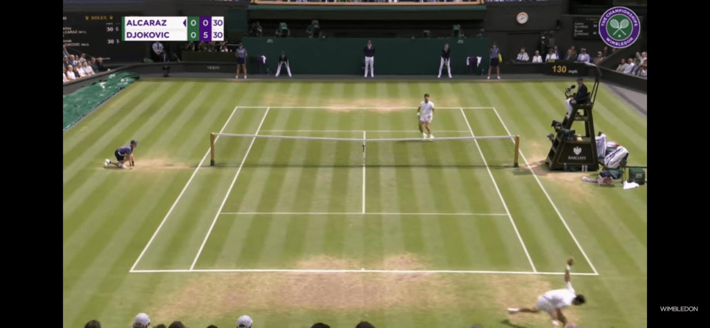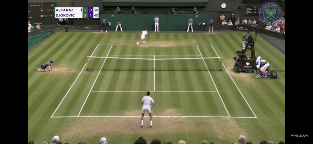 39. On Djokovic not having much choice besides charging the net: earlier in that break point rally, he raked a crosscourt backhand that appeared to hit both the sideline and the baseline, and Alcaraz got it back. Djokovic couldn’t hit through him.