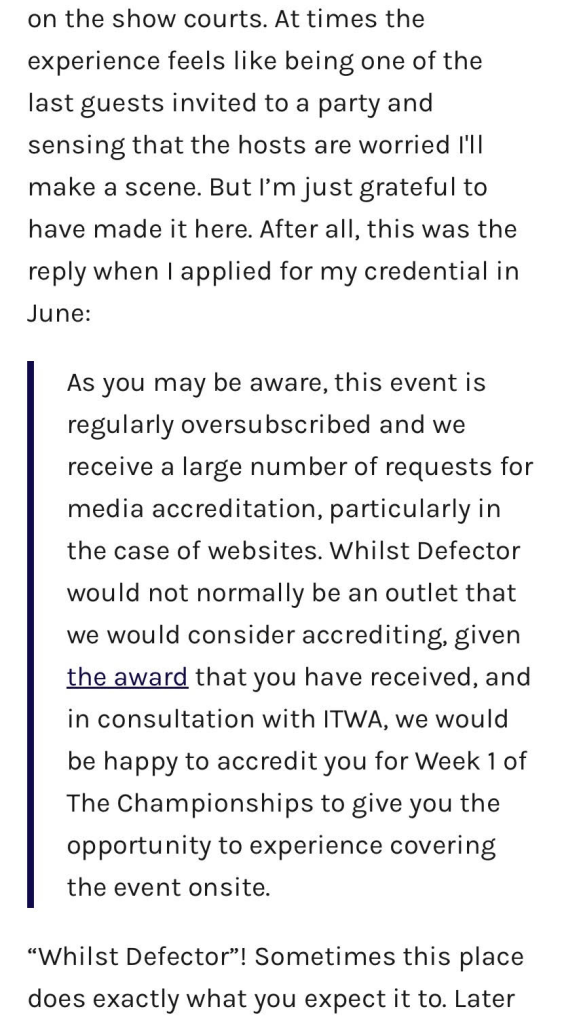 48. If you’ve gotten to this point in this article and somehow want more reading about the Wimbledon final, Giri Nathan wrote a beautiful piece for Defector. It’s also worth reading Giri’s Week One piece. Note that bit where Wimbledon turns their pretentious dial up to eleven when responding to his request for press credentials. I hate Wimbledon sometimes.